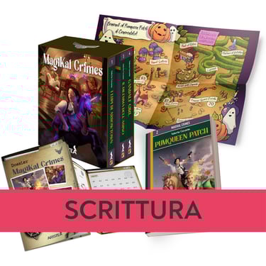 Valeria scrive una serie di quattro libri game per Edizioni Aristea. Tu sei Amy Tang, della divisione Magikal Crimes. Che si tratti del furto di manufatti occulti, di stregoni malvagi che vogliono conquistare il mondo o di incantatori assassini, la prima linea contro i crimini magici sei tu!